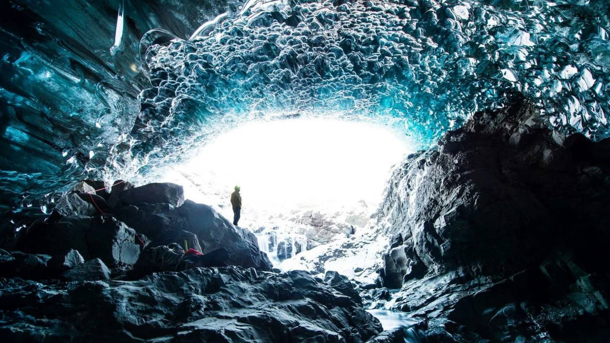cənubundakı Breyoamerkuryekyudl buzlağında mütəşəkkil turda olarkən mağaranın içərisindəki