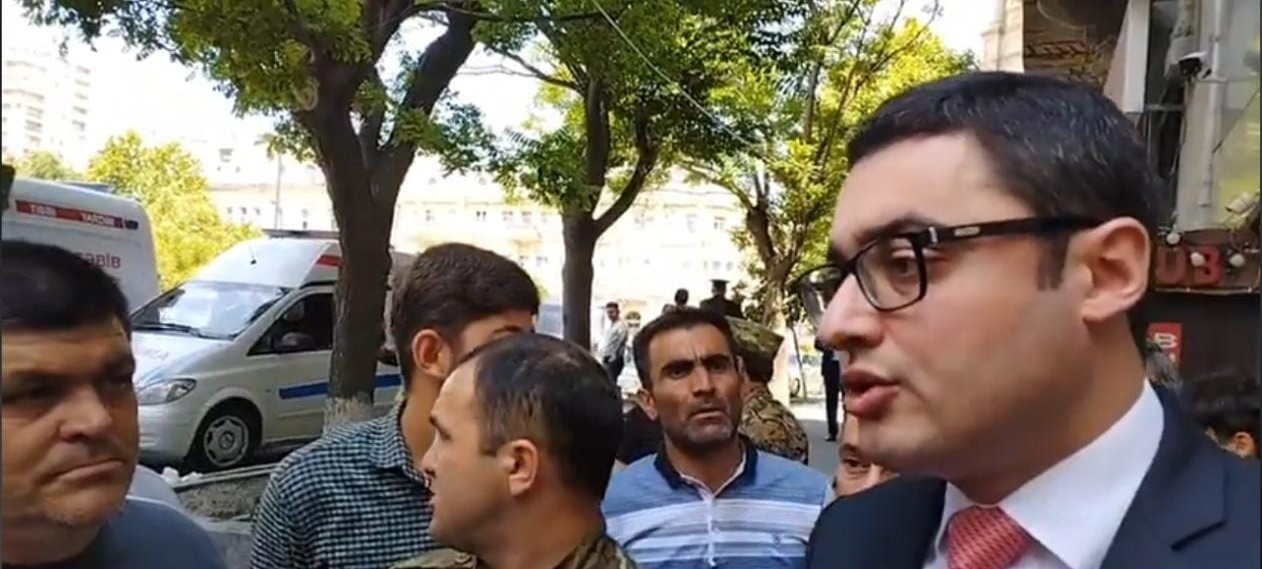 Əmək və Əhalinin Sosial Müdafiəsi Nazirliyinin İctimaiyyətlə Əlaqələr və Kommunikasiya şöbəsinin müdiri Fazil Talıbov etirazçıların qarşısına çıxaraq onların suallarını cavablandırıb.