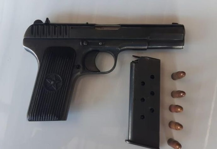 Onun üzərinə baxış zamanı 1 ədəd “TT” markalı tapança, 5 ədəd patron və 1 ədəd patron darağı aşkar olunaraq götürülüb. V.Əliyev odlu silahı bir müddət əvvəl əldə etdiyini, lakin polisə təhvil verməyərək özündə saxladığını bildirib.