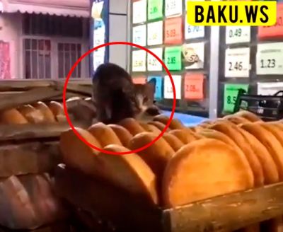 Mağazada çörək yeşiklərə yığılıb. Pişik də fürsətdən istifadə edir və çörəklərin üstündə oturub.