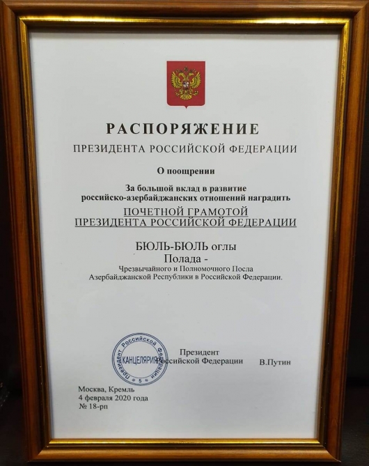 Mediainfo.az AzərTAc-a istinadən xəbər verir ki, görüş zamanı Sergey Lavrov Rusiya Prezidenti Vladimir Putinin tapşırığı ilə onun adından "Rusiya-Azərbaycan münasibətlərinin inkişafına verdiyi böyük töhfəyə görə" Fəxri Fərmanı Azərbaycanın Rusiyadakı səfiri Polad Bülbüloğluna təqdim edib və onun fəaliyyətini yüksək qiymətləndirib.