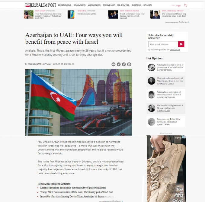 Oxuməni.az-ın verdiyi xəbərə görə, məqalədə ABŞ və Yaxın Şərq ictimaiyyətinin diqqət mərkəzində olan Birləşmiş Ərəb Əmirliklərinin (BƏƏ) İsraillə əlaqələri normallaşdırmasına dair qərarından bəhs edilir və bununla əlaqədar Azərbaycanın örnək olduğu məsələlərə diqqət yetirilir. Müəllif 26 ildən sonra yəhudi və müsəlman dövləti arasında imzalanacaq ilk sülh müqaviləsinin əhəmiyyətini qeyd edir, İsrailin müsəlman ölkəsi Azərbaycanla 1992-ci ildən davam edən tərəfdaşlıq münasibətlərinə nəzər salır.