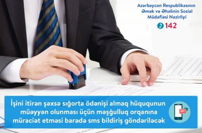 Mediainfo.az saytına nazirlikdən verilən məlumata görə, müəssisənin ləğvi və ya işçilərin (yaxud ştatların) sayının ixtisar edilməsi nəticəsində əmək müqaviləsinə xitam verilmiş, yəni işini itirmiş şəxsə işsizlikdən sığorta ödənişi almaq hüququnun müəyyən olunması üçün müvafiq rayon (şəhər) Məşğulluq mərkəzinə müraciət etməsi barədə mobil telefonuna sms bildiriş göndəriləcək.