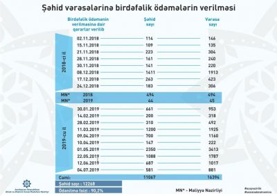 Dövlət başçısının 19 aprel 2018-ci il tarixli və 28 yanvar 2019-cu il tarixli Fərmanlarına əsasən, ümumilikdə 12268 şəhidin vərəsələrinin birdəfəlik ödəmə almaq hüququ müəyyən edilib. Bu günədək onlardan artıq 11067 şəhidin 16394 vərəsəsinə birdəfəlik ödəmənin verilməsinə dair qərar qəbul olunub.