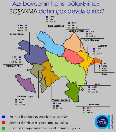 2016-cı il ərzində Azərbaycanda 66 min 771 nikah, 13 min 114 böşanma qeydə alınıb. Yeniavaz.com Dövlət Statistika Komitəsindən açıqlanan məlumatlara istinadən bildirir ki, ötən il böşananların evlənənlərə nisbəti 19,6% olub. Bu isə o deməkdir ki, 2016-cı ildə evlənən hər 5 nəfərdən biri boşanıb. Onu da bildirək ki, 2017-ci ilin ilk 8 ayı ərzində isə qeydiyyat şöbələri tərəfindən 40 min 256 nikah və 9 min 787 boşanma halları qeydə alınıb. İlk 8 ay ərzində ən çox nikah avqust ayında qeydə alınıb. Ən çoxu boşanma halları isə may ayına təsadüf edib. Hesabat dövründə ən çox nikah və boşanma Aran, Gəncə-Qazax iqtisadi rayonlarında rəsmiləşdirilib.
