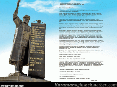 1277-ci il may ayının 13-də Mehmet bəyin türk dilinin dövlət dili elan edilməsi barədə tarixi fərmanı xalqa elan edildi. Fərmanda deyilirdi: "Bu gündən sonra divanda, dərgahda, məclisdə, meydanda və digər yerlərdə türkçədən başqa dil işlədilməyəcək". Bu, Malazgirt döyüşündə qazanılan qələbəyə layiq bir zəfər idi. Bu fərman elan ediləndən 10-15 gün ərzində Anadolunun hər yerində xalq bayram edir, türk dilində