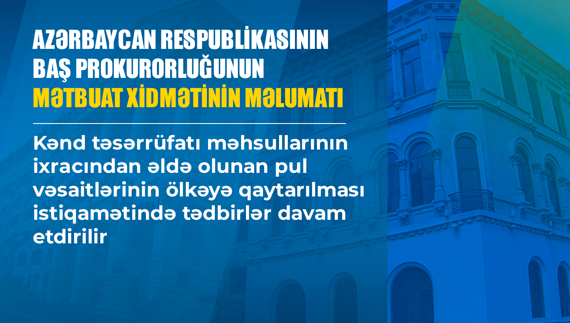 Hazırkı vaxtadək Bakı şəhərinin Nizami, Qaradağ və Binəqədi rayon prokurorluqları tərəfindən həyata keçirilən tədbirlər nəticəsində bəzi sahibkarlıq subyektlərinin xarici ölkələrə ixrac edilmiş kənd təsərrüfatı məhsullarının alqı-satqısından əldə etdikləri pul vəsaitlərinin 54,4 milyon ABŞ dollarından artıq (müvafiq dövrün məzənnəsi ilə 92,4 milyon manatdan artıq) hissəsinin ölkəmizdə müvəkkil edilmiş bank hesabına qaytarılması təmin edilib.