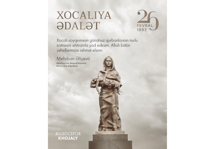 Azərbaycan Respublikasının Birinci vitse-prezidenti Mehriban Əliyeva rəsmi instaqram səhifəsində Xocalı soyqırımının 33-cü ildönümü ilə bağlı paylaşım edib.