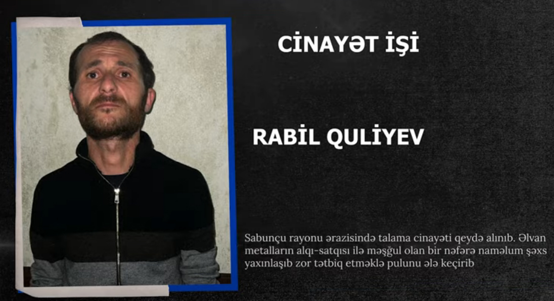 Sabunçu RPİ 13-cü Polis Şöbəsinin əməkdaşlarının keçirdikləri tədbirlərlə soyğunçuluq əməlini törətməkdə təqsirli bilinən, əvvəllər dəfələrlə məhkum olunmuş 39 yaşlı Rabil Quliyev müəyyən edilərək tutulub. Saxlanılan şəxsin üzərindən şəxsi istifadəsi üçün əldə etdiyi psixotrop maddə metamfetamin də aşkarlanaraq götürülüb. R.Quliyev ifadəsində narkotik vasitə aludəçisi olduğunu etiraf edib. Məlumatı mia.gov.az yayıb. Hazırda faktla bağlı araşdırma aparılır.
