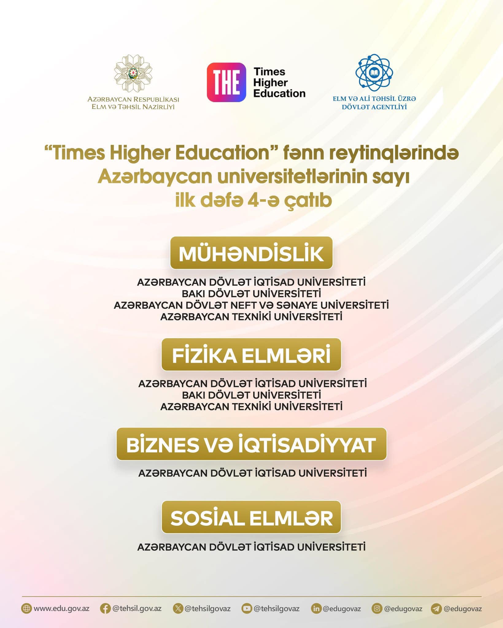 Əlavə olaraq, Azərbaycan universitetlərinin təmsil olunduğu fənn sahələrinin sayı da ilk dəfə 4-ə yüksəlib. Belə ki, “Mühəndislik” və “Fizika elmləri” sahələri ilə yanaşı, bu ildən Azərbaycan “Biznes və iqtisadiyyat” və “Sosial elmlər” sahələri üzrə də aşağıdakı kimi təmsil olunur: