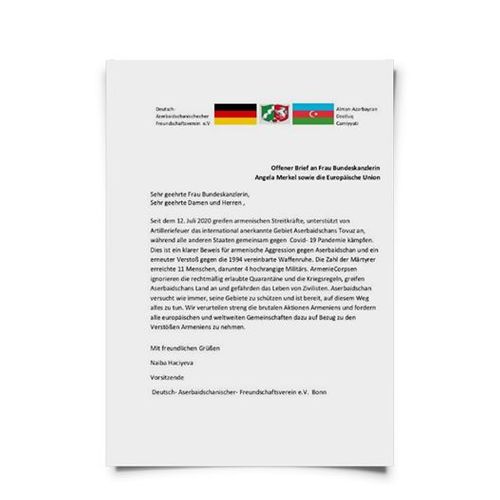 Alman-Azərbaycan Dostluq Cəmiyyətinin sədri Naibə Hacıyeva Ermənistanın Tovuz istiqamətində son təxribatları ilə bağlı Almaniya Kansleri Angela Merkelə və Avropa Birliyinə açıq məktub yazıb.