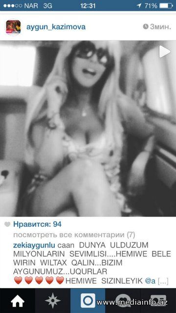 Bu gün səhər saatlarında Natəvan Həbibinin şikayəti əsasında Xəzər Rayon Polis İdarəsinə çağırılan xalq artisti Aygün Kazımova əks tərəfə cavab verib. A.Kazımova sosial şəbəkədə, "canlarım, yolumuz Nabrana, qalan sözlər vız gəlir bana", - deməklə Natavan Həbibinin dediklərini vecinə almadığını nümayiş etdirib.