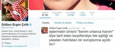 Ağaoğlunu qınayan müğənni Tvitter hesabında, "görəsən, "ortancıl xanımım" deyən bəyə təkarvadlılıq haqda qanunun mövcudluğunu başa salan cinayət işi açılacaqmı?" statusunu paylaşıb.