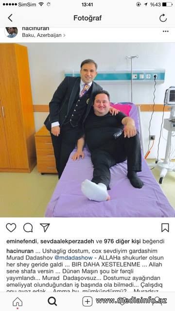Belə ki, aparıcı Hacı Nuran "İnstaqram" səhifəsində xəstəxanada Murad Dadaşovla olan fotosunu paylaşıb.