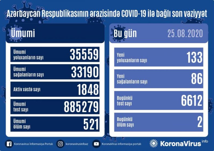 İndiyədək ölkədə ümumilikdə 35 559 nəfərin koronavirus infeksiyasına yoluxması faktı müəyyən edilib, onlardan 33 190 nəfər müalicə olunaraq sağalıb, 521 nəfər vəfat edib, 1 848 nəfərin xüsusi rejimli xəstəxanalarda müalicəsi davam etdirilir.